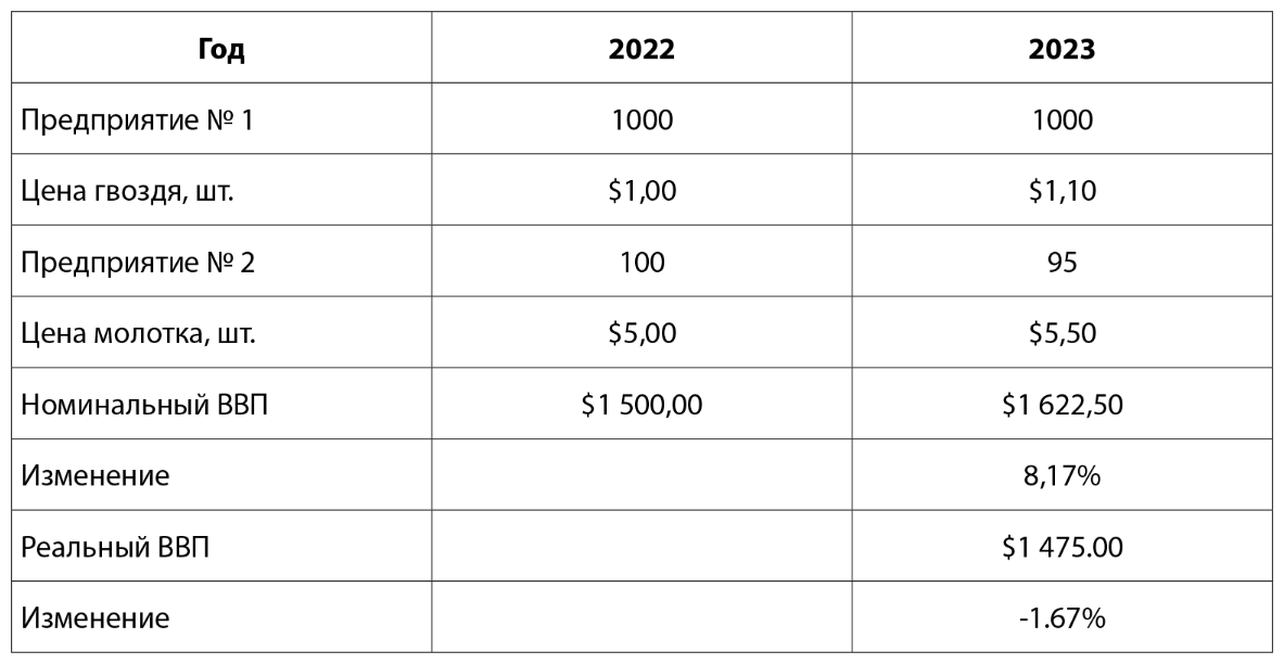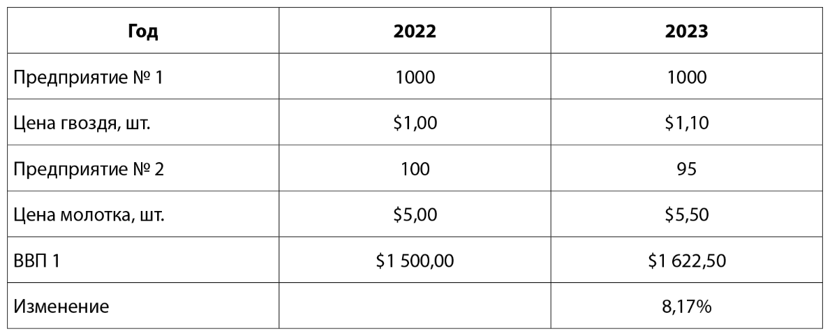 Представим себе простой пример: у нас есть страна А, где работают только два предприятия. Одно производит гвозди, а второе – молотки. В 2022 году первое предприятие произвело 1000 гвоздей и продало их по 1 доллару за штуку, а второе – 100 молотков, и они были проданы по 5 долларов за штуку. В следующем году первое предприятие по-прежнему произвело 1000 гвоздей, но продало их на 10 % дороже, а предприятие № 2 повысило цену на продукцию, но снизило производство.