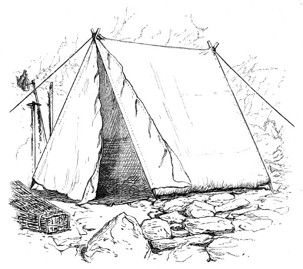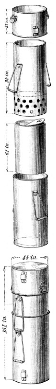 After the alpenstock, or axe-alpenstock, it is of most importance for the mountaineer to supply himself with plenty of good rope. Enough has been said on this subject in different parts of the narrative, as well as in regard to tents. Few other articles are necessary, though many others are desirable, to carry about, and amongst the most important may be reckoned some simple means of boiling water and cooking. At considerable altitudes above the tree-line, it is frequently impossible to carry up wood enough for a camp-fire, and nothing but spirits of wine can be employed. The well-known and convenient so-called “Russian furnace” is the most compact form of spirit lamp that I know, and wonders can be effected with one that is only [pg ix]three inches in diameter. In conjunction with a set of tins like those figured here (which are constructed to be used either with a wood fire or over a spirit lamp), all the cooking can be done that the Alpine tourist requires. For prolonged expeditions of a serious nature a more elaborate equipage is necessary; but upon such small ones as are made in the Alps it would be unnecessarily encumbering yourself to take a whole batterie de cuisine.1