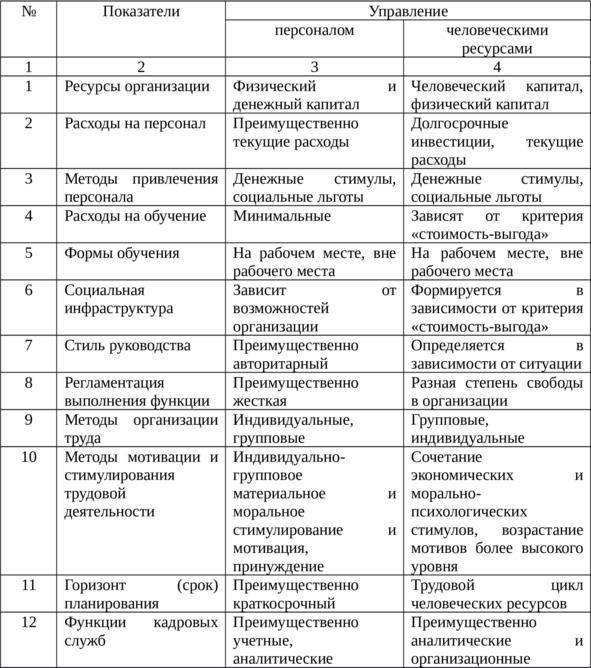 А. Я. Кибанов сравнил отдельные показатели работы с сотрудниками организации при управлении персоналом («традиционный подход») и управлении человеческими ресурсами («новый подход») (табл. 1.1) и пришел к выводу, что методологически правильным будет употребление термина «управление персоналом и человеческими ресурсами». Однако, учитывая, что «традиционное понятие „управление персоналом“ шире понятия „управление человеческими ресурсами“ и включает последнее, являющееся стадией управления персоналом, то правомерно в научной и практической деятельности применять привычный термин — „управление персоналом“» [40].