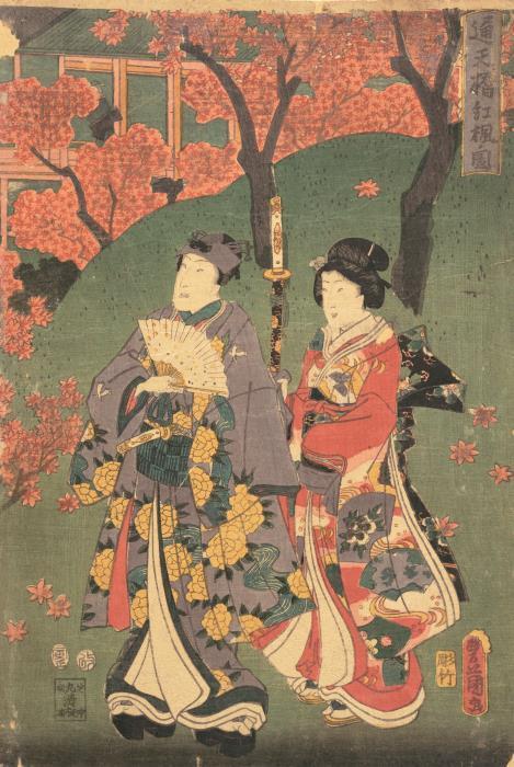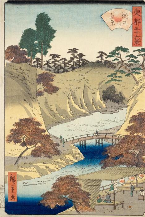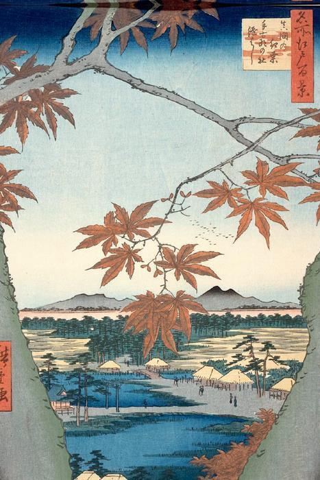 На обложке представлена гравюра Утагавы Хиросигэ «Алые листья кленов в Мама, святилище Тэкона и мост Цуги».