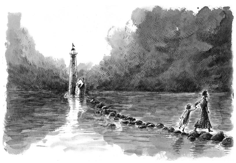 Она смотрит на маяк, чернеющий на фоне тёмного неба. Внутри отец, наверное, сердито ковыляет кругами — она видит, какой он злой, какие свирепые взгляды кидает на дверь, она ясно видит эту дверь, ручку двери, надо лишь протянуть руку и дотронуться до неё…