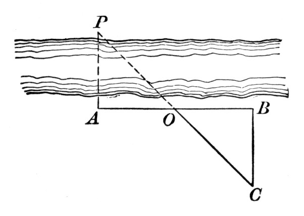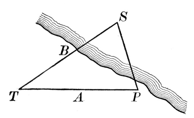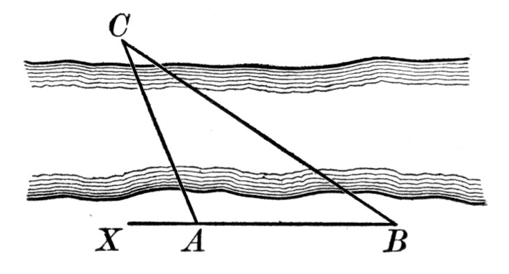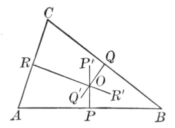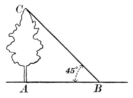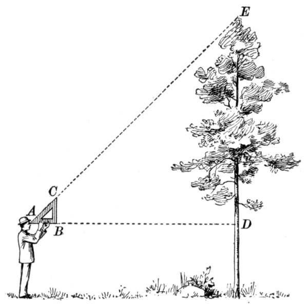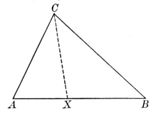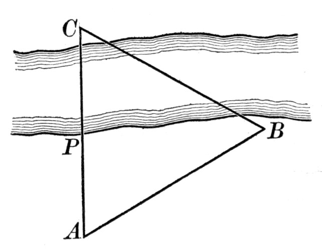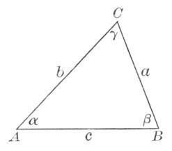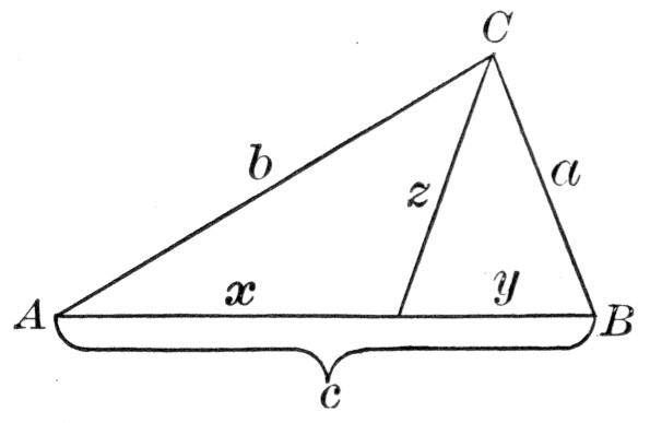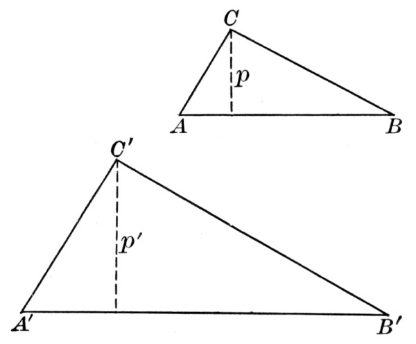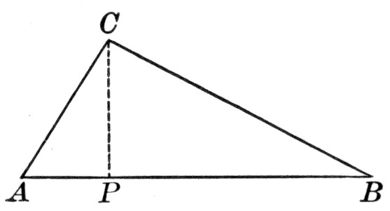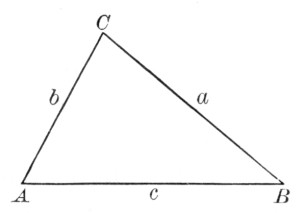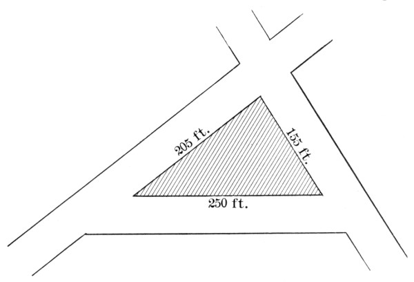 where a, b, and c are the sides, and s is the semiperimeter ½(a + b + c). As a practical application the class may be able to find a triangular piece of land, as here shown, and to measure the sides. If the piece is clear, the result may be checked by measuring the altitude and applying the formula a = ½bh.