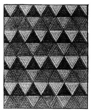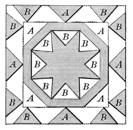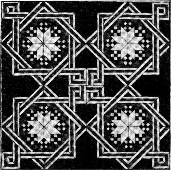 Gauss (1777-1855), a celebrated German mathematician, proved (in 1796) that it is possible also to inscribe a regular polygon of 17 sides, and hence polygons of 2n · 17 sides, or 17, 34, 68, ..., sides, and also 3 · 17 = 51 and 5 · 17 = 85 sides, by the use of the compasses and straightedge, but the proof is not adapted to elementary geometry. In connection with the study of the regular polygons some interest attaches to the reference to various forms of decorative design. The mosaic floor, parquetry, Gothic windows, and patterns of various kinds often involve the regular figures. If the teacher uses such material, care should be taken to exemplify good art. For example, the equilateral triangle and its relation to the regular hexagon is shown in the picture of an ancient Roman mosaic floor on page 274.[84] In the next illustration some characteristic Moorish mosaic work appears, in which it will be seen that the basal figure is the square, although at first sight this would not seem to be the case.[85] This is followed by a beautiful Byzantine mosaic, the original of which was in five colors of marble. Here it will be seen that the equilateral triangle and the regular hexagon are the basal figures, and a few of the properties of these polygons might be derived from the study of such a design. In the Arabic pattern on page 276 the dodecagon appears as the basis, and the remarkable powers of the Arab designer are shown in the use of symmetry without employing regular figures.