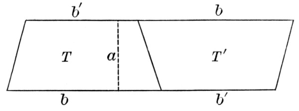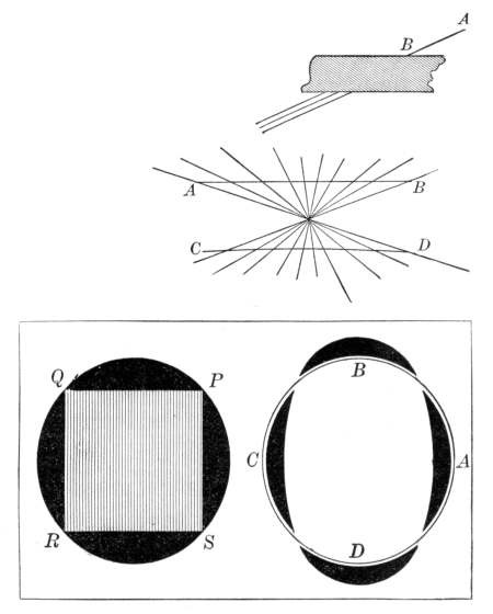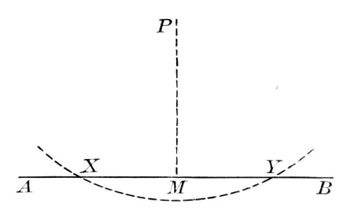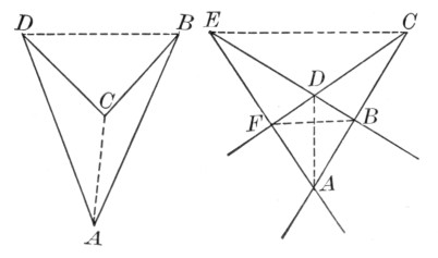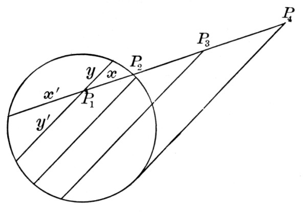Since we can construct √a by means of the straightedge and compasses, it would be possible for us to square the circle if we could express π by a finite number of square roots. Conversely, every geometric construction reduces to the intersection of two straight lines, of a straight line and a circle, or of two circles, and is therefore equivalent to a rational operation or to the extracting of a square root. Hence a geometric construction cannot be effected by the straightedge and compasses unless it is equivalent to a series of rational operations or to the extracting of a finite number of square roots. It was proved by a German professor, Lindemann, in 1882, that π cannot be expressed as an algebraic number, that is, as the root of an equation with rational coefficients, and hence it cannot be found by the above operations, and, furthermore, that the solution of this famous problem is impossible by elementary geometry.[86]