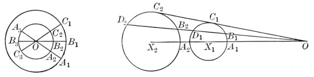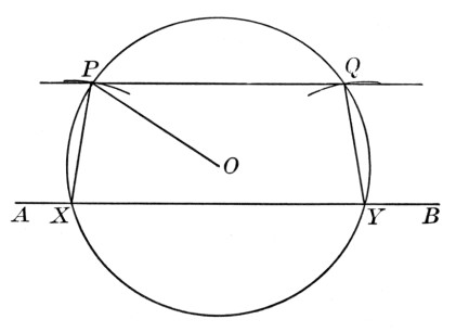 As to the mensuration of the circle it is well for us to take a broad view before coming down to details. There are only four leading propositions necessary for the mensuration of the circle and the determination of the value of π. These are as follows: (1) The inscribing of a regular hexagon, or any other regular polygon of which the side is easily computed in terms of the radius. We may start with a square, for example, but this is not so good as the hexagon because its side is incommensurable with the radius, and its perimeter is not as near the circumference. (2) The perimeters of similar regular polygons are proportional to their radii, and their areas to the squares of the radii. It is now necessary to state, in the form of a postulate if desired, that the circle is the limit of regular inscribed and circumscribed polygons as the number of sides increases indefinitely, and hence that (2) holds for circles. (3) The proposition relating to the area of a regular polygon, and the resulting proposition relating to the circle. (4) Given the side of a regular inscribed polygon, to find the side of a regular inscribed polygon of double the number of sides. It will thus be seen that if we were merely desirous of approximating the value of π, and of finding the two formulas c = 2πr and a = πr2, we should need only four propositions in this book upon which to base our work. It is also apparent that even if the incommensurable cases are generally omitted, the notion of limit is needed at this time, and that it must briefly be reviewed before proceeding further.