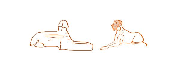 Рассматривая скульптуру Сфинкса по фото, я задумалась: зачем этой скульптуре такие длинные-предлинные передние лапы? Это же огромное количество затраченных человеко-часов под палящим солнцем! И средств! (А я по образованию экономист). Зачем это было надо? Ответ нашелся случайно, при рассмотрении фотографии собак породы «дог». По пропорциям Сфинкс, на мой взгляд, больше напоминает длинноногую собаку, чем льва. У львов лапы несколько короче. Поэтому тот кто создал Сфинкса, наверно, специально подчеркнул такую длину конечностей, не считаясь с понесенными материальными, трудовыми и временными затратами. Кстати, головной убор на Сфинксе немного ассоциируется с висящими по бокам собачьими ушами. Может быть, когда-то это была морда «лучшего друга человека», на которой потом «выбили» лицо фараона? К примеру тогда, когда туловище скульптуры было засыпано песком и над поверхностью осталась только голова животного.