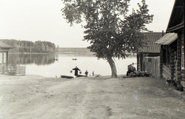 Вид Октябрьской улицы, мостика, с которого мы, дети, любили ловить летом в любую погоду. У этого тополя я подолгу сидел с дедушкой Фроловым. 1959 год. Тополь живет и по ныне, в 2021-м году!