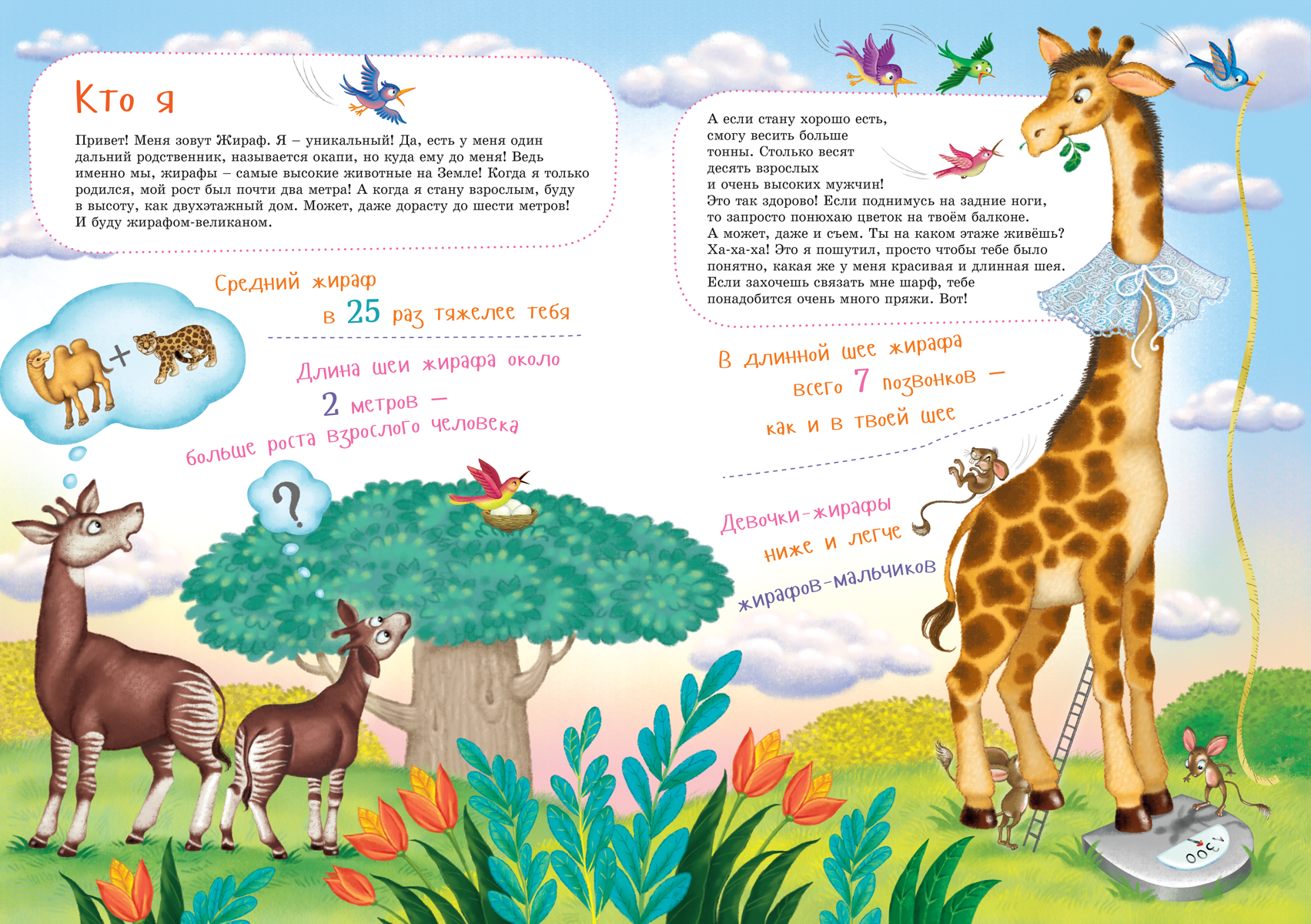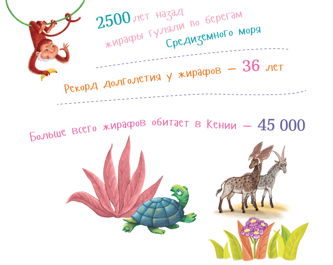 Я живу в Африке, это далеко. Надо лететь на самолёте много часов. Но я в самолёт не помещусь! Живу я в лесах и саваннах, где гуляет много разных зверей... Но жирафы заметнее всех! Нас, таких высоченных, видно издалека. Поэтому многим кажется, что нас – целая толпа. Хотя на самом деле жирафов не так уж много. Но и не так уж и мало! Я это точно знаю, ведь люди нас всё время пересчитывают! Ещё бы – считать жирафов проще, чем, например, землероек! Так вот – сегодня нас в Африке не то 110, не то 150 тысяч. Да ещё сколько-то живёт в зоопарках по всему миру – и правильно, такую красоту надо всем показывать! Ведь не каждый сможет добраться до Африки… Так что против зоопарков мы не возражаем: там за нами так хорошо ухаживают, что мы живём гораздо дольше, чем в дикой природе. Иногда – до 30 лет, а для жирафа это очень даже много.