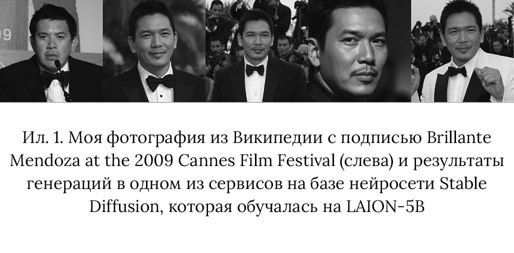 Помимо фотографий моего собственного лица с разных сайтов и из соцсетей, при помощи сервиса Have I Been Trained? я обнаружила в LAION-5B фотографию филиппинского режиссера Бриллианте «Данте» Мендозы, сделанную мной на цифровой фотоаппарат Sony во время итоговой пресс-конференции на Каннском фестивале в 2009 году. Эта фотография в плохом разрешении до сих пор иллюстрирует статью о Мендозе в нескольких версиях «Википедии». Когда-то редактор онлайн-энциклопедии нашел ее в моем аккаунте на платформе Flickr, которая была «инстаграмом до инстаграма»[3], и попросил передать в общественное пользование по лицензии Creative Commons, регулирующей (разумеется, не в российском правовом поле) свободное распространение контента. Речь о том, что когда-нибудь на этом изображении будут обучать нейросетевую модель, в конце нулевых, разумеется, не шла.