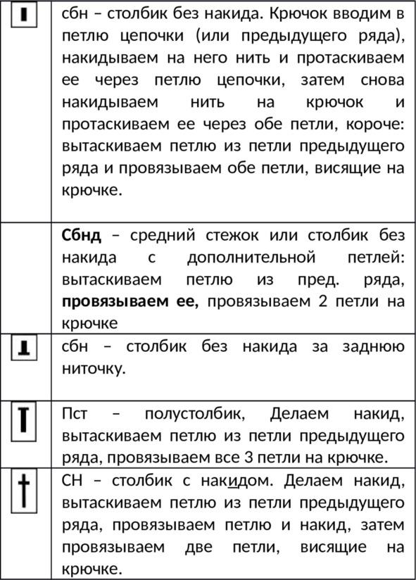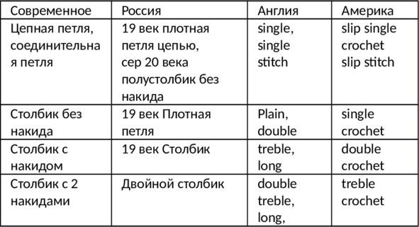Вообще говоря, обозначения элементов вязания крючком имеют много вариантов. Когда были опубликованы первые номера моей газеты «Татiана», мои подруги говорили: «А вот моя знакомая сказала, что в газете неправильные обозначения, надо полустолбик без накида, а не цепная петля». Для меня такое обозначение было дико, какой полустолбик, это просто воздушная петля, прикрепленная к петле предыдущего ряда, тем более, что училась я по прабабушкиной дореволюционной газете «Новый Русский Базар», где это обозначалось как «плотная петля цепью».