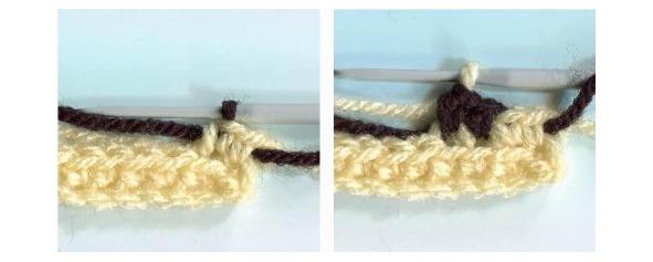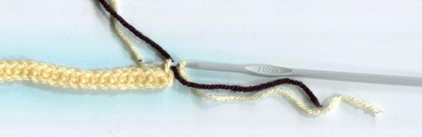 Вяжем два сбн, охватывая желтую нить, черной нитью, не забывая сменить нить при провязывании последнего столбика.