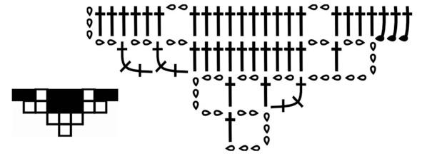 Убавки ячеек в конце ряда осуществляются очень легко, просто не довязывается нужное количество ячеек. В начале ряда после провязывания последней в ряду ячейки по верху ячеек, надо провязать цепные петли. При убавке одной прозрачной ячейки в конце: не провязываем последние 2 петли предпоследнего столбика, 1С3Н в последний столбик, провязанный с предпоследним столбиком. Если надо убавить больше ячеек, то провязывать надо только 1 накид из столбика с 3-мя накидами, и только после выполнения последнего столбика с 3-мя накидами спускаем по две петли.