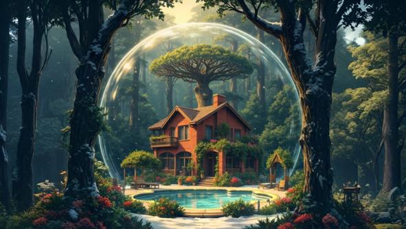 Вернёмся к дому. Заходим в купол, справа — бассейн с площадкой, шезлонгами и беседкой. Дом у нас двухэтажный кирпичный. Зайдя в дом, вы будете смотреть на лестницу, под ней — туалет и выход на задний двор, с левой стороны вы увидите кухню. Там всё по-простому. Кухонный гарнитур под дерево, барная стойка, а в противоположном углу — стол и диванчик уголком. Знаете, такие ещё в моде были какое-то время. Справа — комната с аркой, там нет двери. Можно сказать, что коридор плавно перетекает в эту комнату, их отделяют небольшие перегородки по бокам. В той комнате стоят всевозможные музыкальные инструменты мира. Я, кстати, умею играть на всех, об этом чуть позже расскажу. На втором этаже у нас две спальни, и у каждой — свой туалет, ванная и гардероб. Больше ничего и не нужно. В любом случае, я могу щёлкнуть пальцами и всё что нужно появится. На заднем дворе место моей энергии. Там стоит большое дерево, ствол уходит в самое небо, под ним неглубокое озеро, больше похожее по размерам на лужу, это связь с моим создателем, для восполнения сил.