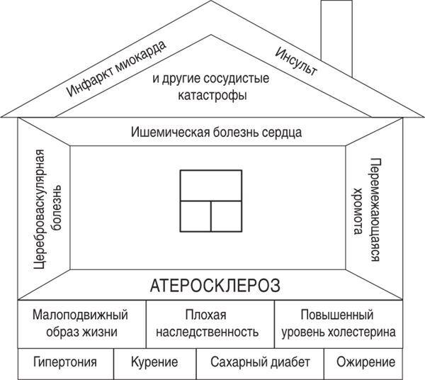 Сверху ложится большая плита. Это пол нашего дома, который называется атеросклероз – сужение сосудов за счет образования в них холестериновых бляшек. Само здание дома – это сердечно-сосудистые заболевания (ишемическая болезнь сердца, цереброваскулярная болезнь, перемежающаяся хромота), то есть клинически выраженный атеросклероз. Бляшка растет, просвет сосуда сужается, и крови к органам поступает все меньше. Когда сужается коронарная артерия и сердце не получает достаточного количества крови, развивается стенокардия, если поражаются сосуды в ногах, что особенно часто происходит у курильщиков, тогда появляется перемежающаяся хромота.