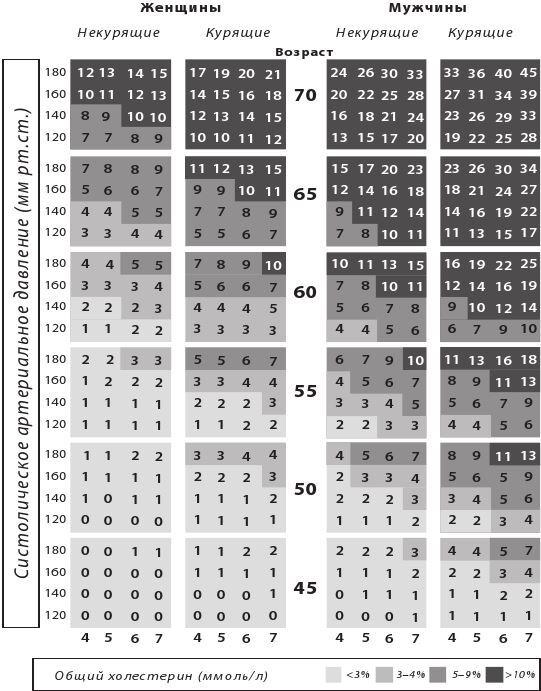Число, полученное на пересечении заданных параметров, означает вероятность смерти от инфаркта, инсульта или другой сосудистой катастрофы в ближайшие 10 лет. Кстати, высоким уже считается риск, равный 5 %. Думаете 5 из сотни – это немного? А если этим пятерым по 50 лет?