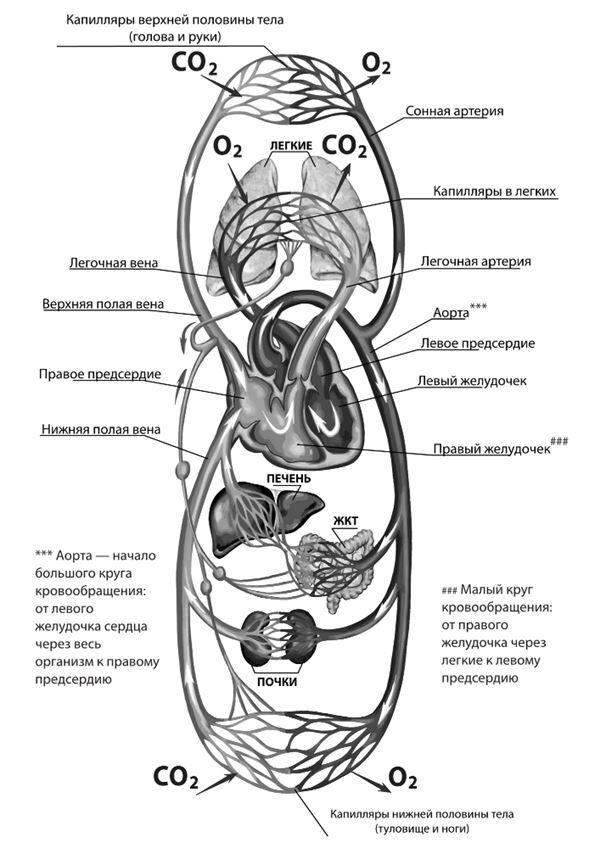 После того как в тканях происходит газообмен, т. е. кислород обменивается на углекислый газ, венозная кровь по системе вен возвращается к сердцу и впадает в правое предсердие. Мы не будем подробно останавливаться на заболеваниях вен, оставив эту тему сосудистым хирургам, но в соответствующем разделе поговорим о венозных тромбозах и их осложнениях, например когда оторвавшийся тромб по системе вен прилетает в легочную артерию и закупоривает ее.