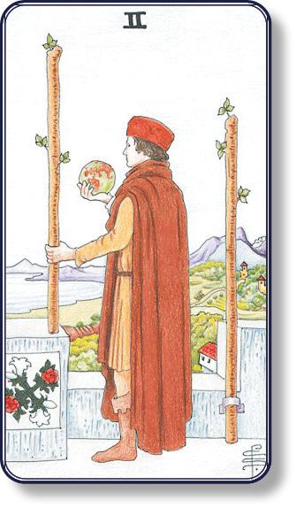 Для начала я хочу обратить внимание на саму композицию карты и противоречия ее описанию. С утверждением Уэйта, что перед нами господин со своими владениями, невозможно согласиться, так как персонаж карты, судя по его изображению, им не является. Это не правитель и не владелец территории. Он не осматривает свои владения, а устремил взор вдаль на морскую гладь, словно ожидая чего-то издалека. Глобус в руках персонажа не говорит о его величии или могуществе, он не обладает ими, а сравнивает те возможности (жезлы), которые есть у него на данный момент, с той реальностью, которую он видит перед собой или высматривает на горизонте. Основным значением данного аркана является «соотнесение своих возможностей с реальностью», что приводит человека пока к временному замешательству и неопределенности в действиях. Кроме того, на этапе двойки человек не может быть владельцем чего-либо, так как это этап выбора действия. Об этом говорит и сама композиция карты.