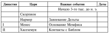 Царь Скорпион, живший в начале исторической эпохи, правил не всей территорией Египта, ибо носил только корону Юга. Он встал во главе союза, объединившего племена горы и моллюска, а также два новых племени, символами которых впоследствии стали изображения богов Сета и Хонсу. Вместе они одержали победу над двумя другими племенами – чибисами и луками, продолжавшими играть в Египте важную роль.