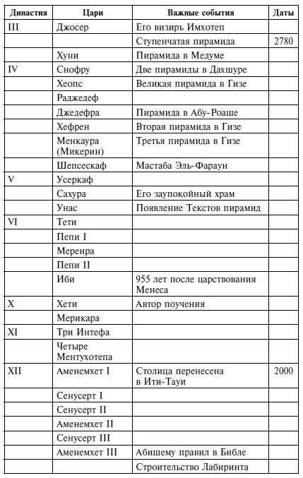 Проверить, насколько вкусен пудинг, можно, только съев его. Так и в точности предлагаемого метода датировки можно удостовериться, если благодаря ему удастся точно определить даты событий из истории Египта и даже соседних стран, происходивших в период Нового царства и позднее. Исследователи больше не могут вычитать некое количество лет из времени правления одного царя и добавлять их к царствованию другого. Если изменить приведенную ниже хронологическую таблицу, она не будет соответствовать тому, что нам известно о Древнем Востоке. Ниже приведены имена царей, которые впоследствии будут упомянуты в данной книге, а также даты их правления.