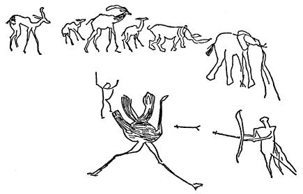 Рис. 1. Вереница животных и охота на страуса. Слоны, носороги и жирафы переселились южнее до начала царствования представителей I династии. Страусы и антилопы не покинули египетские пустыни