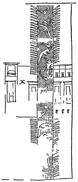 Рис. 3. Кишащее крокодилами озеро на Суэцком перешейке. Озеро служило границей между Египтом и пустыней, населенной кочевниками. Рельеф из Карнака