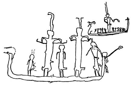 Дань состояла из скота, ослов и овец, а так как в Египте традиции всегда играли крайне важную роль, такие же подати поступали туда из этой страны и в период правления царей V династии, о чем свидетельствуют рельефы, датированные данным временем. Другие захватчики прибыли с востока на длинных лодках, нос и корма которых были загнуты почти под прямым углом (рис. 9). Суда подобного типа изображены на вырезанной из слоновой кости ручке ножа, обнаруженного в Гебель-эль-Араке, а также на скалах, расположенных вдалеке от долины Нила. Аналогичные рисунки были обнаружены в Месопотамии (рис. 10). Предводителем этих людей был персонаж с когтистыми ногами и бородой, очень похожий на Гильгамеша из вавилонского эпоса. На его голову надета корона. Голыми руками он мог поставить льва на задние лапы.