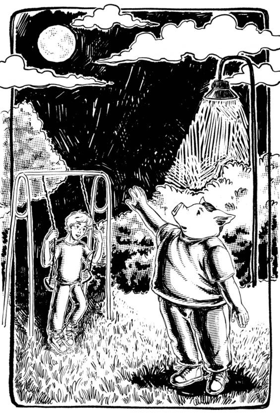 Мне никак не удавалось хоть как-то объяснить себе происходящее. Но страх рос, буквально парализуя всё тело. Почувствовав, что в следующий момент просто не смогу дышать, я рванул с качелей. Однако, пробежав несколько шагов, остановился, поняв, что свинья продолжает стоять где стояла.
