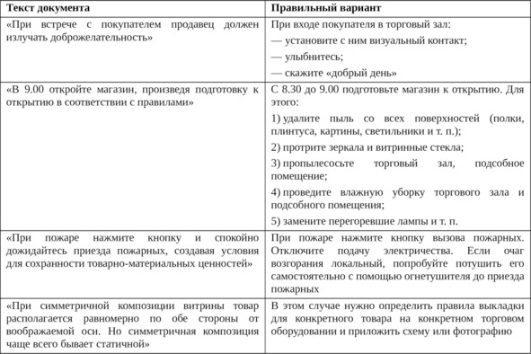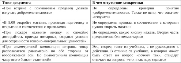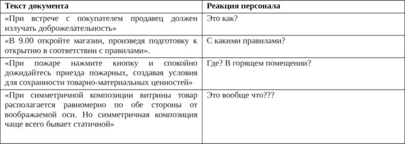 ВАЖНЫЙ КОММЕНТАРИЙ: мы часто получаем письма с просьбой выслать тот или иной стандарт, поэтому хочется предостеречь вас от желания взять что-то, разработанное для другой компании, и сказать: «Вот правило, — следуйте ему, начиная с сегодняшнего дня». Так не получится, ведь в каждом магазине есть свои особенности работы: товарная и форматная специфика, товародвижение, нюансы взаимоотношений с поставщиками, ожидания и потребности покупателей.