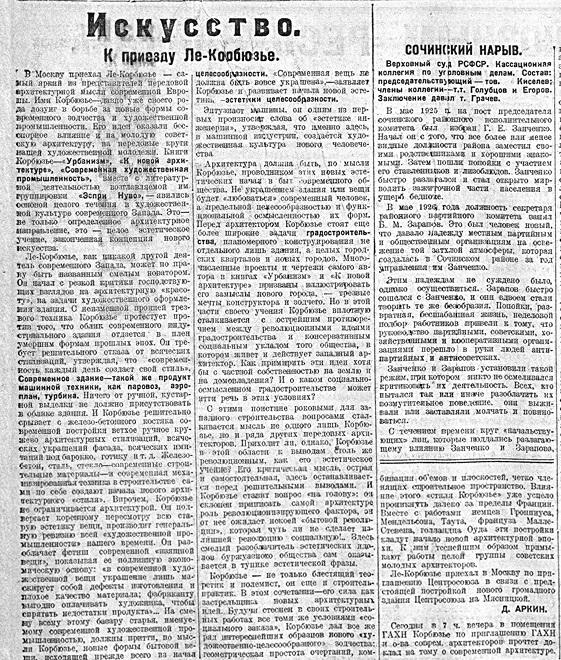 В Москву приехал Ле Корбюзье — самый яркий из представителей передовой архитектурной мысли современной Европы. Имя Корбюзье — давно уже своего рода лозунг в борьбе за новые формы современного зодчества и художественной промышленности. Его идеи оказали бесспорное влияние и на молодую советскую архитектуру <…>.
