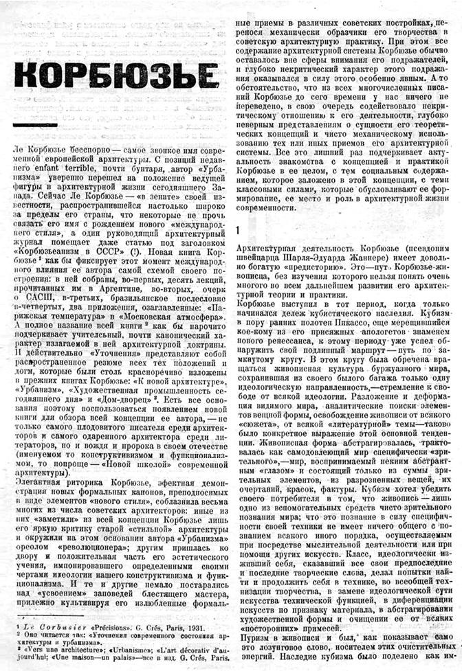 В лице Корбюзье перед нами на редкость законченное сочетание главы и теоретика определенной школы, насчитывающей немало адептов во всем мире (не исключая и СССР), выдающегося архитектора-практика и, наконец, деятеля других искусств, именно живописи и художественной промышленности. <…> Говоря о Корбюзье, о его архитектурной концепции, мы в то же время говорим о достаточно обширном круге явлений, занимающих виднейшее место в архитектурном развитии новейшего времени110.