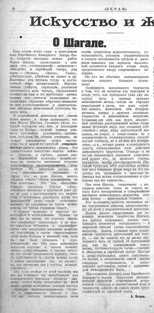 А. Ветров [Аркин Д.]. О Шагале // Экран. Вестник театра — искусства — кино — спорта. 1921. № 7. 15–17 ноября. С. 8.