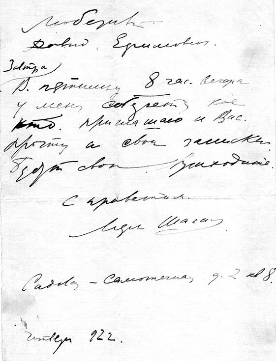 «Любезный Давид Ефимович. Завтра <…> у меня соберется кое-кто, приглашаю и Вас. Прочту и свои записки. Будут свои. Приходите» — из письма Шагала Аркину, начало мая 1922. См.: Молок Ю. На перекрестке между Россией и Западом. С. 79.