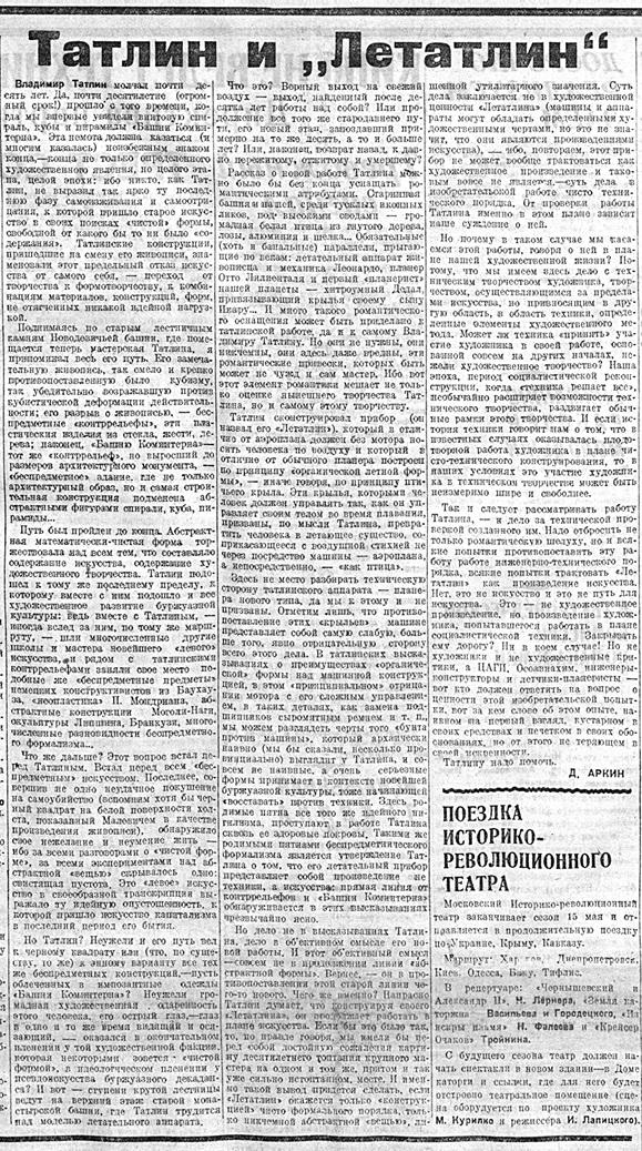 Аркин Д. Татлин и «Летатлин» // Советское искусство. 1932. № 17. 9 апреля. С. 3.