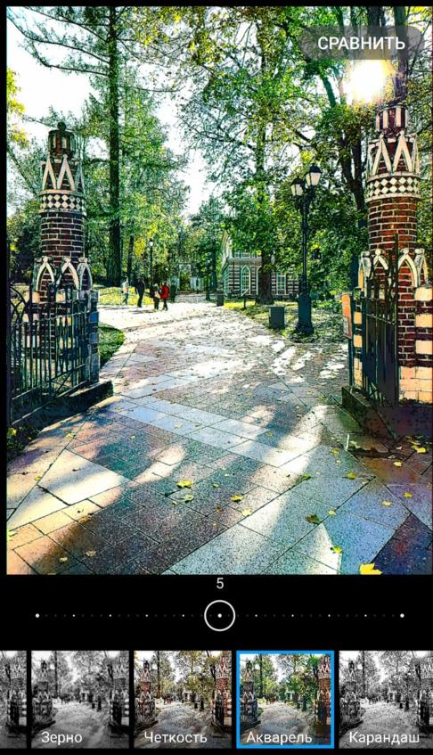 Редактор позволяет изменить яркость, контрастность, насыщенность и использовать фильтры, кадрировать фото: