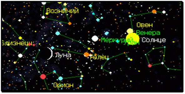 Рис. 4. Положение планет на звёздном небе 20.06.1606 года. Меркурий в середине ретроградного движения совпал с Солнцем между Тельцом и Близнецами. Венера между Овном и Тельцом.
