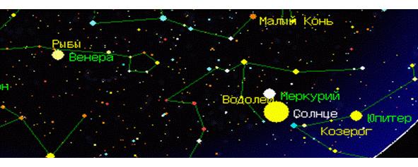 Рис. 3. Положение планет на звёздном небе 15 02 1606 года. Меркурий в середине ретроградного движения совпал с Солнцем в Водолее. Юпитер находился между Козерогом и Водолеем, двигался в сторону Водолея; Венера в Рыбах.
