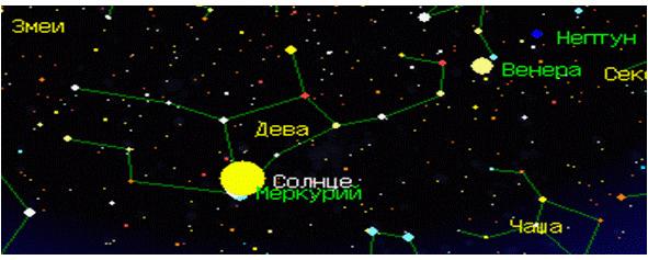 Рис. 5. Положение планет на звёздном небе 16 10 1606 года. Меркурий в середине ретроградного движения совпал с Солнцем в созвездии Дева. Венера наблюдалась между Львом и Раком.