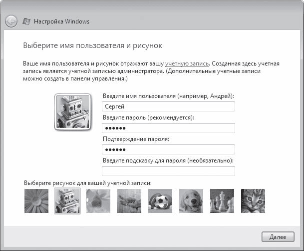 В первом диалоговом окне нужно ввести имя и при необходимости защитить компьютер от посторонних лиц паролем учетной записи, а также задать рисунок (рис. 1.5). Подробно о том, что представляет собой учетная запись, рассказано в начале гл. 7.