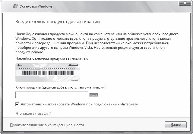 Далее появится окно ввода ключа продукта для активизации (рис. 1.4). Каждому изданию Windows Vista соответствует свой ключ активизации, поэтому после его ввода система автоматически определит, какая версия Windows Vista должна быть установлена. Вы можете установить систему и без ввода серийного номера, сняв флажок Автоматически активировать Windows при подключении к Интернету. В этом случае при нажатии кнопки Далее и подтверждении ваших действий появится список доступных для установки версий Windows Vista. Выделите нужную, установите флажок Выбран приобретенный выпуск Windows и нажмите кнопку Далее. Система, установленная без ключа активизации, будет функционировать в течение 30 дней. Чтобы продолжить ее использование по истечении месячного срока, нужно будет позаботиться о получении ключа и выполнении активизации.