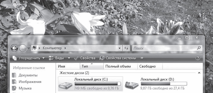 Полупрозрачность заголовка заметна при перемещении окна – размытое содержимое лежащих ниже объектов прослеживается под активным окном (рис. 2.2).