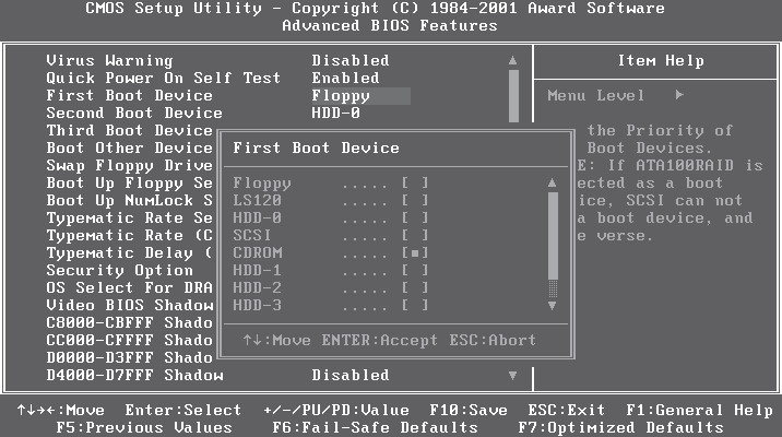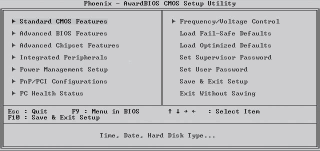 В первую очередь в настройках BIOS в качестве первого загрузочного устройства необходимо указать CD-ROM, так как система будет установлена с DVD. Поскольку вы являетесь начинающим пользователем и наверняка ни разу не сталкивались с BIOS, пошагово рассмотрим весь процесс изменения порядка загрузки компьютера на примере Phoenix-AwardBIOS. Если ваш компьютер имеет другую версию BIOS, вид меню и название его пунктов могут несколько отличаться, но принципиально порядок действий останется тем же.