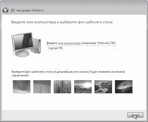 Нажмите кнопку Далее. На следующей странице вам будет предложено выбрать рисунок для Рабочего стола, а также ввести имя компьютера (оно необходимо для идентификации в локальной сети) (рис. 1.6). Имя компьютера предлагается по умолчанию исходя из имени учетной записи, однако вы можете его изменить.