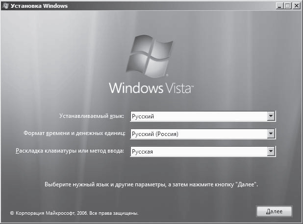 После того как будет выполнено копирование файлов, необходимых для начала работы программы установки Windows Vista, вы увидите ее первое окно (рис. 1.3), в котором вам предстоит выбрать устанавливаемый язык, формат даты и раскладку клавиатуры. Если во всех списках выбран вариант Русский, не меняйте данные настройки и просто нажмите Далее.