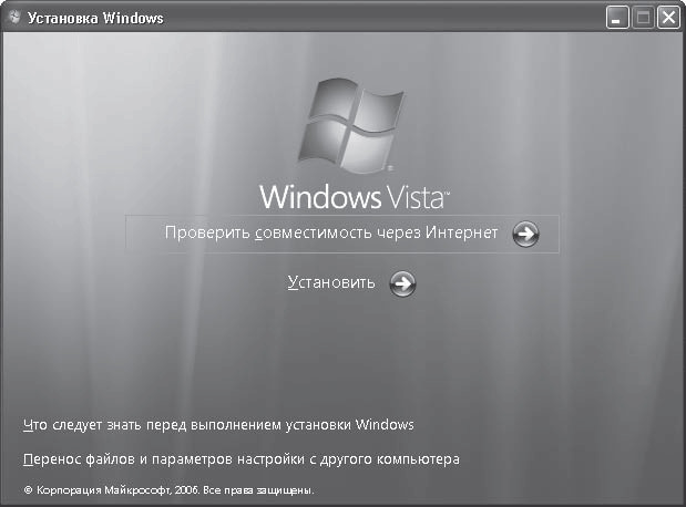 Находясь в старой версии Windows, вставьте в DVD-привод установочный диск Windows Vista и дождитесь появления окна, изображенного на рис. 1.9. Перейдите по ссылке Установить. В следующем окне вам будет предложено подключиться к Интернету для получения последних обновлений программы установки. Имеет смысл делать это лишь в том случае, если вы обладаете высокоскоростным подключением к Сети. В противном случае загрузка обновлений займет неоправданно много времени, и лучше от нее отказаться. Все последующие этапы установки (начиная с ввода ключа для выполнения активизации) идентичны тем, что были описаны в предыдущем подразделе, поэтому останавливаться на них мы не будем. Единственное отличие возникнет на этапе выбора типа установки, когда наряду с вариантом полной установки будет доступно обновление. Вам следует перейти по ссылке Полная установка для сохранения предыдущей версии Windows.