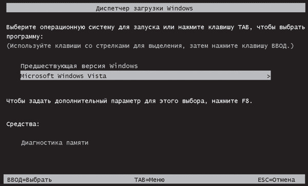 Когда установка Windows Vista будет завершена и произойдет перезагрузка компьютера, вы увидите на экране Диспетчер загрузки Windows (рис. 1.10), в котором с помощью клавиш управления курсором необходимо переместиться к нужной операционной системе и нажать клавишу Enter для начала ее загрузки.