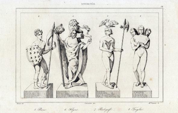 А, как вам такое изображение германских (славянских?) богов из книги «Saxonia. Museum für Sächsische Vaterlandskunde. Erster Band» (Саксония. Музей саксонского отечества. Первый том в 24 выпусках с 74 литографированными приложениями, выпуски 1–24 (май 1834 г. — апрель 1835 г.). В одном томе.) на 72 странице?