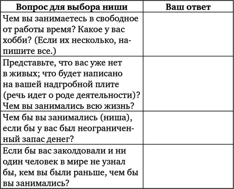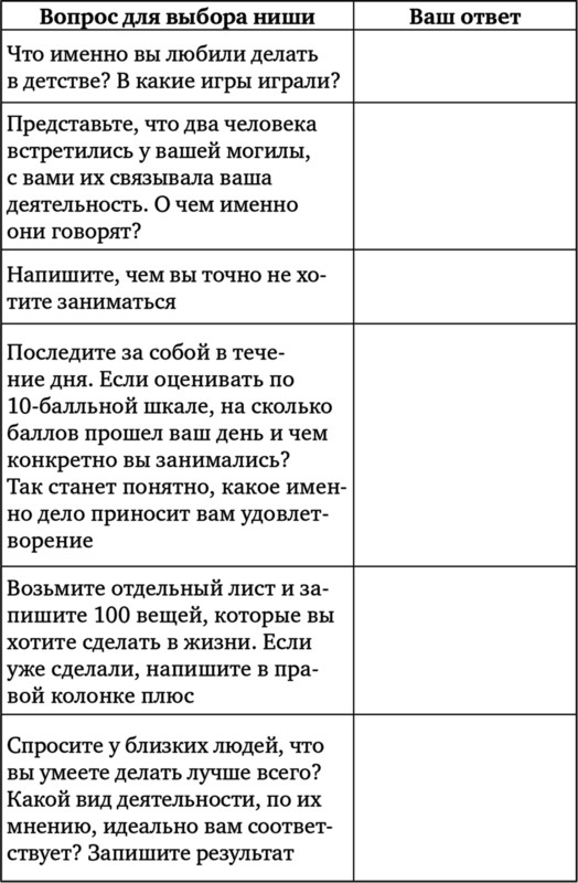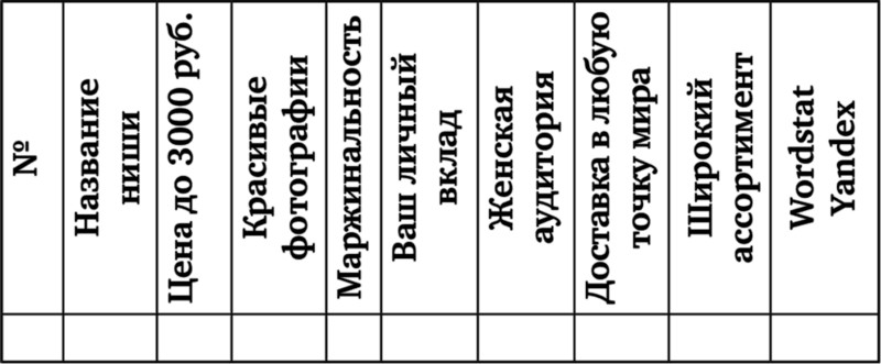 Если у вас нет никакого опыта в бизнесе, то ваша цель – выбрать дело, которое будет приносить деньги. И заработать деньги. Не стоит долго искать любимое дело, копаться в душе, нужно просто выписать 100 ниш. Совершенно любых. Сделайте таблицу: по вертикали – список из 100 ниш, по горизонтали – список критериев. Если ниша соответствует критерию, ставьте «+». Если нет – оставляете пустое место. Так вы проходите все критерии по одной нише и переходите к другой (табл. 2).