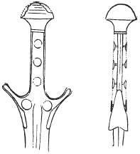 По форме эти мечи повторяли все характерные черты ранних бронзовых прототипов, но отличались по своему назначению. Это было длинное оружие, предназначенное для нанесения рубящих ударов и использовавшееся возничими колесниц. Во многих случаях это предназначение подчеркивается формой кончика лезвия, который, в сущности, вовсе не является таковым, поскольку либо закруглен, либо обрезан так, что напоминает квадрат, либо имеет форму, напоминающую рыбий хвост (рис. 13, а – с). Последняя черта таким же образом вошла в моду семнадцатью столетиями позже, когда во второй четверти XVII в. итальянцы начали делать рапиры с двумя маленькими плоскими язычками на конце длинного тонкого клинка, который позволял эффективно использовать конкретный прием – страмазоне (рубящий удар в лицо). Это один из классических ударов итальянской фехтовальной школы, настолько характерный, что, как видите, для его выполнения даже создали специальное оружие.