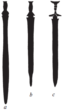 Рис. 7. Три меча периода позднего бронзового века. Типы: а – «Гальштатт», b – «Язык Карпа», с – «Долина Роны»