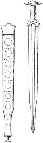 Это было отличное оружие; ни в одной стране тогда не производили ничего, что могло бы сравниться с мечом, который археологи обнаружили при раскопках в Ирландии (рис. 2, b). Его длина составляет приблизительно 30 дюймов, а ширина не более ⅝ дюйма в середине лезвия; сечение превосходной, сложной ромбовидной формы. Хотя область распространения таких находок не ограничивается территорией Британских островов, они родились здесь, причем, скорее всего, именно в Ирландии, поскольку лучшие из них, да, собственно, и вообще подавляющее большинство были обнаружены не где-нибудь в другом месте, а именно там.